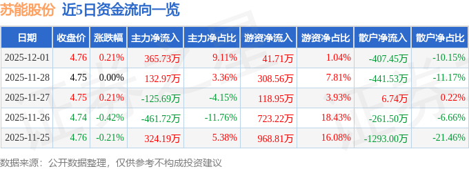 证券之星消息,截至2025年12月1日收盘,苏能股份(600925)报收于4.76元,上涨0.21%,换手率0.53%,成交量8.44万手,成交额4014.98万元。