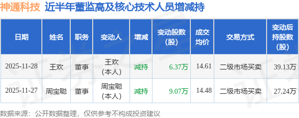 证券之星消息,根据12月1日市场公开信息、上市公司公告及交易所披露数据整理,神通科技(605228)最新董监高及相关人员股份变动情况:2025年11月28日公司董事王欢共减持公司股份6.37万股,占公司总股本为0.0147%。变动期间公司股价上涨3.19%,11月28日当日收盘报14.88元。