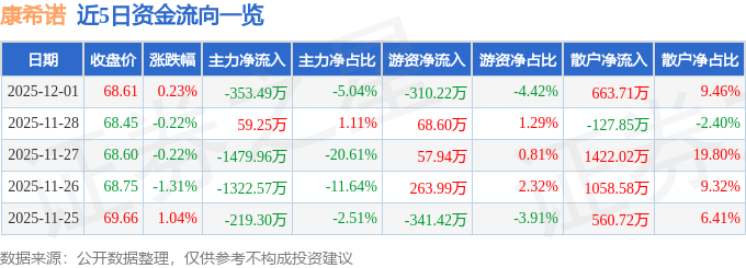 12月1日的资金流向数据方面,主力资金净流出353.49万元,占总成交额5.04%,游资资金净流出310.22万元,占总成交额4.42%,散户资金净流入663.71万元,占总成交额9.46%。