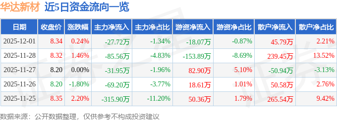 证券之星消息,截至2025年12月1日收盘,华达新材(605158)报收于8.34元,上涨0.24%,换手率0.48%,成交量2.48万手,成交额2072.62万元。