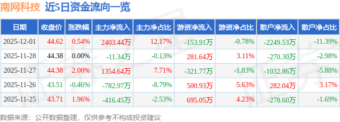 证券之星消息,截至2025年12月1日收盘,南网科技(688248)报收于44.62元,上涨0.54%,换手率1.98%,成交量4.53万手,成交额1.97亿元。