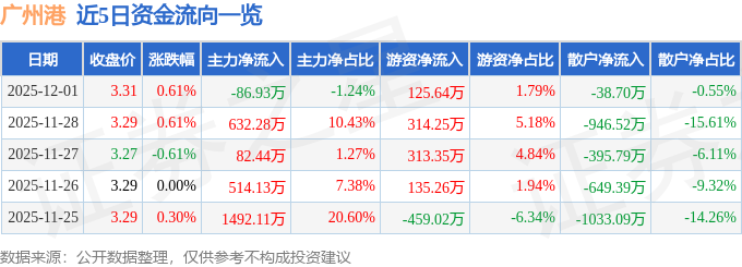 证券之星消息,截至2025年12月1日收盘,广州港(601228)报收于3.31元,上涨0.61%,换手率0.28%,成交量21.17万手,成交额7010.17万元。