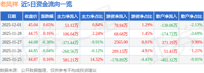 证券之星消息,截至2025年12月1日收盘,老凤祥(600612)报收于45.04元,上涨0.65%,换手率0.43%,成交量1.36万手,成交额6110.09万元。