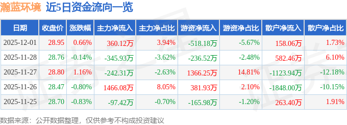 证券之星消息,截至2025年12月1日收盘,瀚蓝环境(600323)报收于28.95元,上涨0.66%,换手率0.39%,成交量3.17万手,成交额9140.93万元。