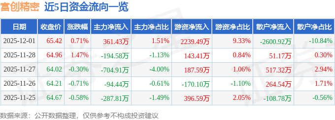 证券之星消息,截至2025年12月1日收盘,富创精密(688409)报收于65.42元,上涨0.71%,换手率1.21%,成交量3.71万手,成交额2.4亿元。