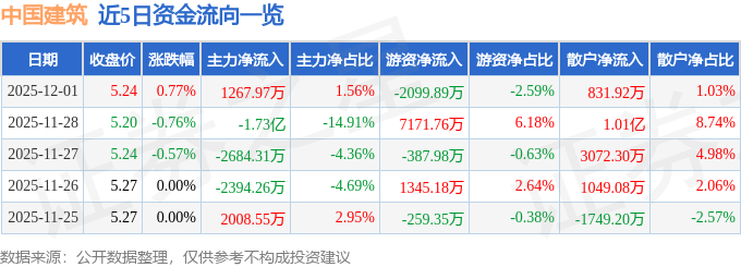 证券之星消息,截至2025年12月1日收盘,中国建筑(601668)报收于5.24元,上涨0.77%,换手率0.38%,成交量155.49万手,成交额8.12亿元。