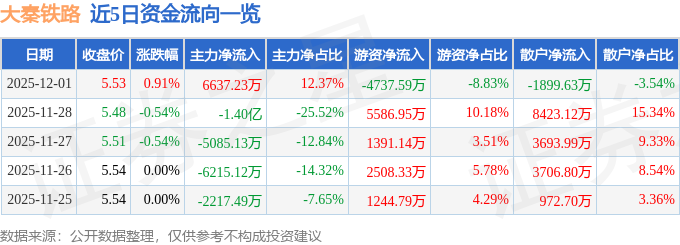 证券之星消息,截至2025年12月1日收盘,大秦铁路(601006)报收于5.53元,上涨0.91%,换手率0.48%,成交量97.67万手,成交额5.37亿元。