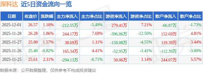 证券之星消息,截至2025年12月1日收盘,深科达(688328)报收于26.57元,上涨1.1%,换手率1.55%,成交量1.46万手,成交额3872.95万元。