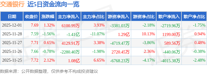 证券之星消息,截至2025年12月1日收盘,交通银行(601328)报收于7.69元,上涨1.32%,换手率0.78%,成交量202.42万手,成交额15.51亿元。