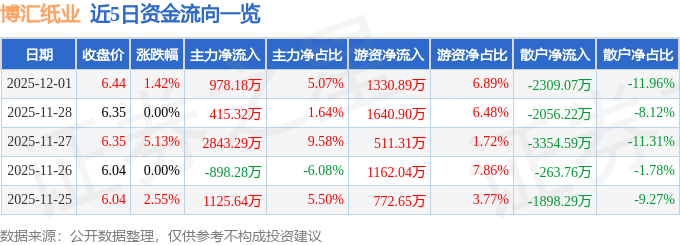 证券之星消息,截至2025年12月1日收盘,博汇纸业(600966)报收于6.44元,上涨1.42%,换手率2.26%,成交量30.24万手,成交额1.93亿元。