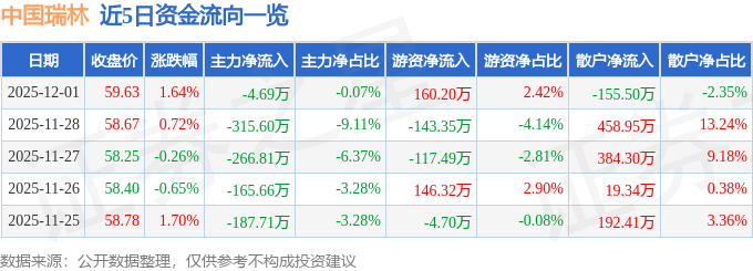 证券之星消息,截至2025年12月1日收盘,中国瑞林(603257)报收于59.63元,上涨1.64%,换手率4.45%,成交量1.11万手,成交额6618.41万元。