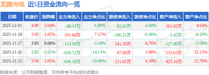 证券之星消息,截至2025年12月1日收盘,龙腾光电(688055)报收于4.0元,上涨2.04%,换手率0.26%,成交量8.76万手,成交额3471.47万元。