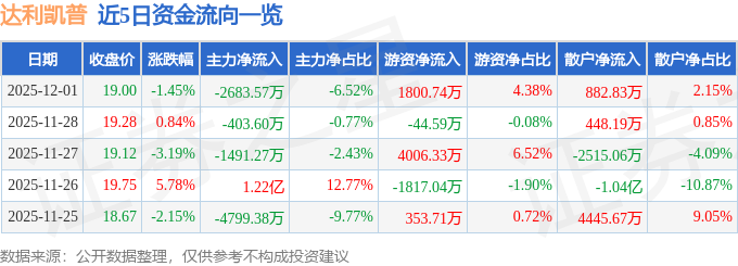 证券之星消息,截至2025年12月1日收盘,达利凯普(301566)报收于19.0元,下跌1.45%,换手率10.42%,成交量21.62万手,成交额4.11亿元。
