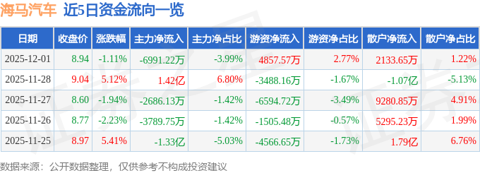 证券之星消息,截至2025年12月1日收盘,海马汽车(000572)报收于8.94元,下跌1.11%,换手率11.87%,成交量194.89万手,成交额17.53亿元。
