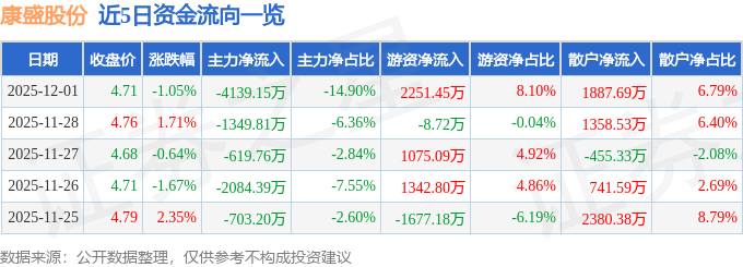 证券之星消息,截至2025年12月1日收盘,康盛股份(002418)报收于4.71元,下跌1.05%,换手率5.17%,成交量58.74万手,成交额2.78亿元。
