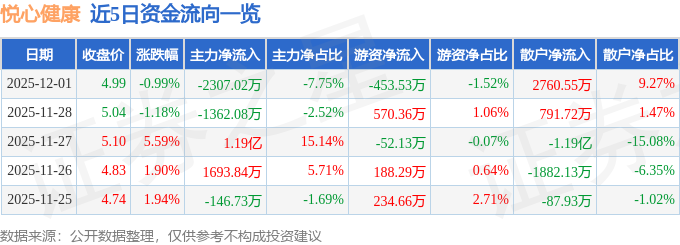 证券之星消息,截至2025年12月1日收盘,悦心健康(002162)报收于4.99元,下跌0.99%,换手率6.49%,成交量59.63万手,成交额2.98亿元。