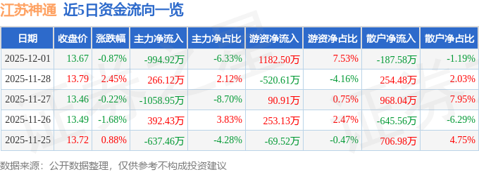 12月1日的资金流向数据方面,主力资金净流出994.92万元,占总成交额6.33%,游资资金净流入1182.5万元,占总成交额7.53%,散户资金净流出187.58万元,占总成交额1.19%。