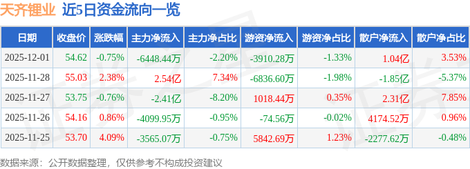 证券之星消息,截至2025年12月1日收盘,天齐锂业(002466)报收于54.62元,下跌0.75%,换手率3.61%,成交量53.22万手,成交额29.34亿元。