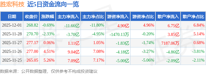 证券之星消息,截至2025年12月1日收盘,胜宏科技(300476)报收于268.82元,下跌0.69%,换手率4.34%,成交量37.14万手,成交额98.77亿元。