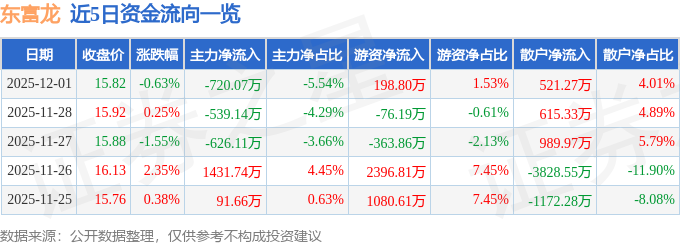 证券之星消息,截至2025年12月1日收盘,东富龙(300171)报收于15.82元,下跌0.63%,换手率1.45%,成交量8.17万手,成交额1.3亿元。