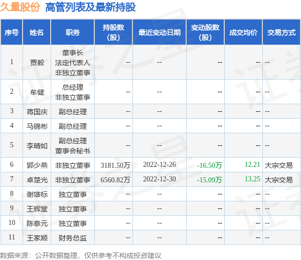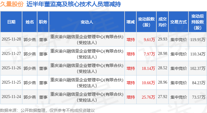 久量股份近半年内的董监高及核心技术人员增减持详情如下:
