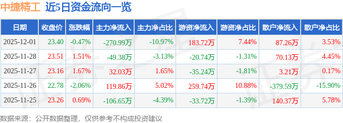 证券之星消息,截至2025年12月1日收盘,中捷精工(301072)报收于23.4元,下跌0.47%,换手率1.56%,成交量1.05万手,成交额2469.4万元。