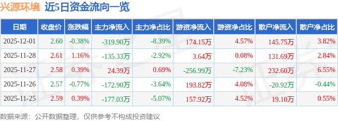 证券之星消息,截至2025年12月1日收盘,兴源环境(300266)报收于2.6元,下跌0.38%,换手率0.94%,成交量14.62万手,成交额3813.52万元。