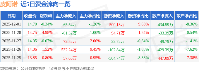 证券之星消息,截至2025年12月1日收盘,皮阿诺(002853)报收于14.7元,下跌0.34%,换手率2.75%,成交量3.54万手,成交额5195.6万元。