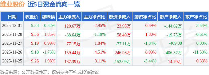 12月1日的资金流向数据方面,主力资金净流入120.67万元,占总成交额2.95%,游资资金净流入23.95万元,占总成交额0.59%,散户资金净流出144.62万元,占总成交额3.54%。