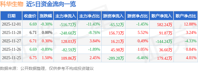 证券之星消息,截至2025年12月1日收盘,科华生物(002022)报收于6.69元,下跌0.3%,换手率1.3%,成交量6.69万手,成交额4519.83万元。