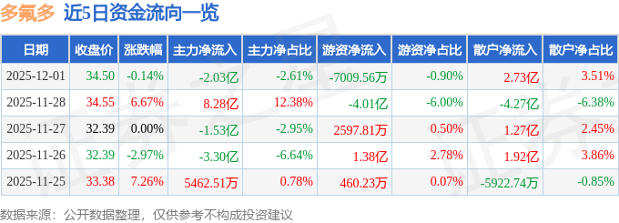证券之星消息,截至2025年12月1日收盘,多氟多(002407)报收于34.5元,下跌0.14%,换手率20.23%,成交量218.64万手,成交额77.71亿元。