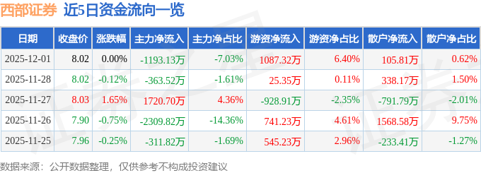 证券之星消息,截至2025年12月1日收盘,西部证券(002673)报收于8.02元,上涨0.0%,换手率0.52%,成交量21.21万手,成交额1.7亿元。
