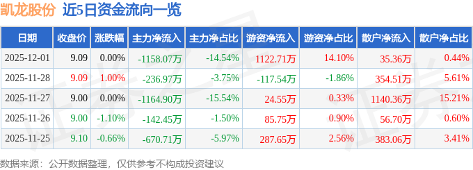 12月1日的资金流向数据方面,主力资金净流出1158.07万元,占总成交额14.54%,游资资金净流入1122.71万元,占总成交额14.1%,散户资金净流入35.36万元,占总成交额0.44%。