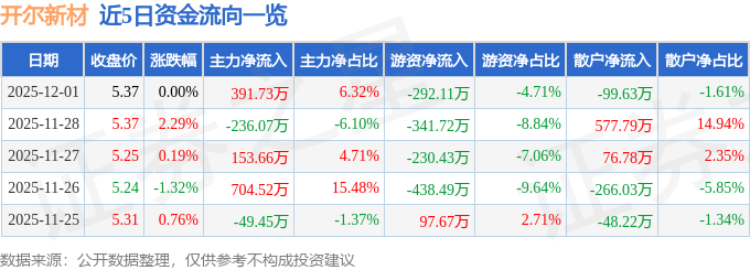 12月1日的资金流向数据方面,主力资金净流入391.73万元,占总成交额6.32%,游资资金净流出292.11万元,占总成交额4.71%,散户资金净流出99.63万元,占总成交额1.61%。