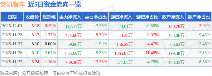证券之星消息,截至2025年12月1日收盘,安凯客车(000868)报收于5.18元,上涨0.19%,换手率0.95%,成交量6.95万手,成交额3590.33万元。