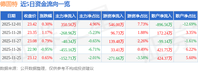 12月1日的资金流向数据方面,主力资金净流入350.56万元,占总成交额4.96%,游资资金净流入546.0万元,占总成交额7.73%,散户资金净流出896.56万元,占总成交额12.69%。