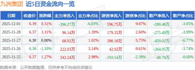 证券之星消息,截至2025年12月1日收盘,九洲集团(300040)报收于6.39元,上涨0.31%,换手率1.99%,成交量10.29万手,成交额6576.56万元。