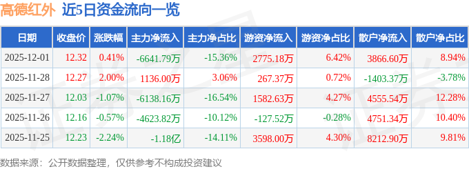 证券之星消息,截至2025年12月1日收盘,高德红外(002414)报收于12.32元,上涨0.41%,换手率1.03%,成交量34.93万手,成交额4.32亿元。