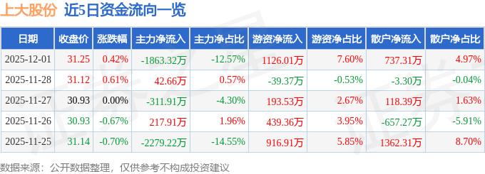 证券之星消息,截至2025年12月1日收盘,上大股份(301522)报收于31.25元,上涨0.42%,换手率1.68%,成交量4.71万手,成交额1.48亿元。