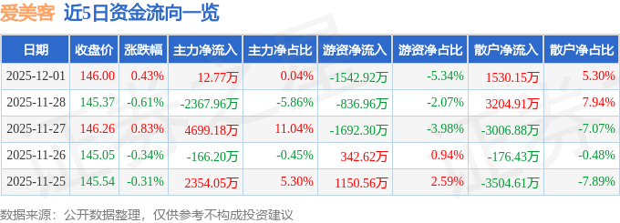证券之星消息,截至2025年12月1日收盘,爱美客(300896)报收于146.0元,上涨0.43%,换手率0.95%,成交量1.99万手,成交额2.89亿元。