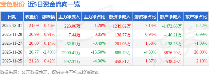证券之星消息,截至2025年12月1日收盘,宝色股份(300402)报收于21.09元,上涨0.48%,换手率3.4%,成交量8.28万手,成交额1.75亿元。