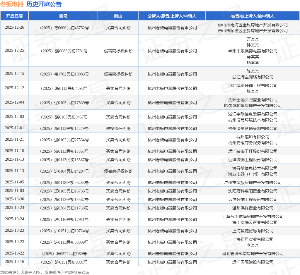 案号:(2025)辽0105民初17539号根据统计,近一年内以杭州老板电器股份有限公司为当事人的历史开庭公告有212则,其中案由为“买卖合同纠纷”的公告以145则居首,其次为“侵害商标权纠纷”有38则,“承揽合同纠纷”有4则。历史开庭公告(前20条)如下: