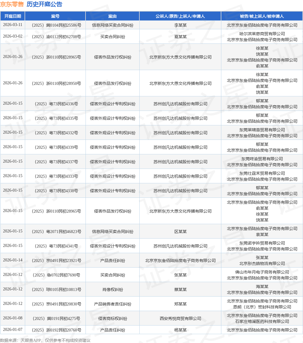 案号:(2025)闽0302民初7174号根据统计,近一年内以北京京东叁佰陆拾度电子商务有限公司为当事人的历史开庭公告有1467则,其中案由为“侵害商标权纠纷”的公告以381则居首,其次为“信息网络买卖合同纠纷”有267则,“侵害外观设计专利权纠纷”有165则。历史开庭公告(前20条)如下: