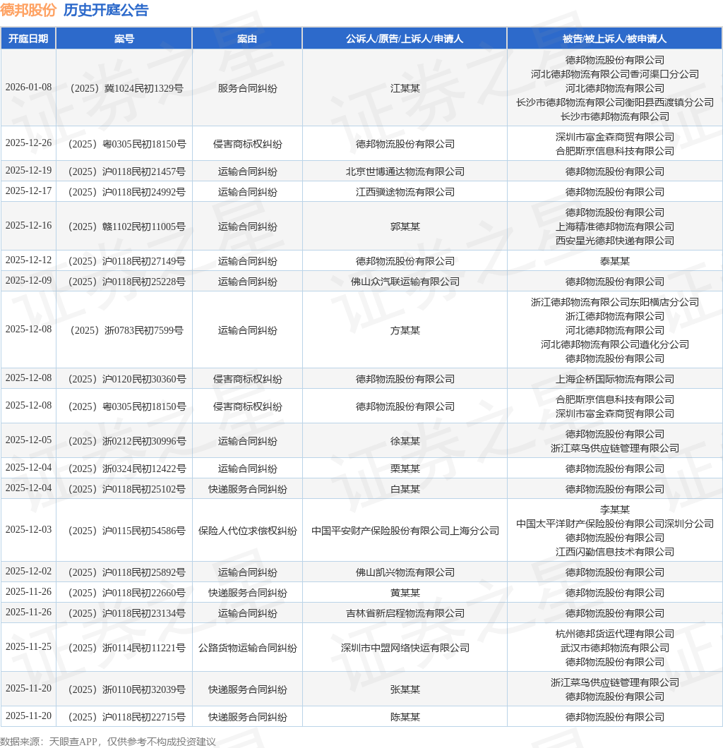 案号:(2025)浙0324民初12422号根据统计,近一年内以德邦物流股份有限公司为当事人的历史开庭公告有365则,其中案由为“快递服务合同纠纷”的公告以106则居首,其次为“运输合同纠纷”有74则,“劳动争议”有29则。历史开庭公告(前20条)如下: