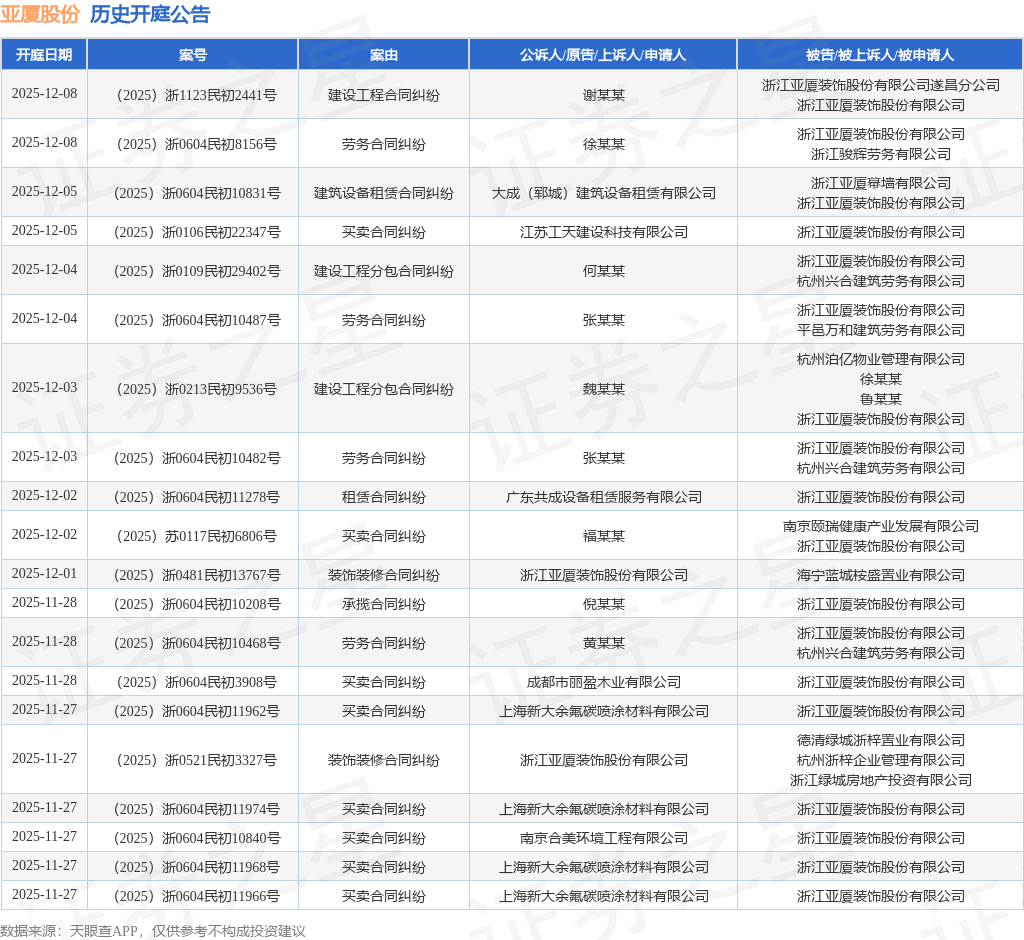 案号:(2025)浙0109民初29402号根据统计,近一年内以浙江亚厦装饰股份有限公司为当事人的历史开庭公告有580则,其中案由为“买卖合同纠纷”的公告以208则居首,其次为“劳务合同纠纷”有110则,“建设工程施工合同纠纷”有62则。历史开庭公告(前20条)如下: