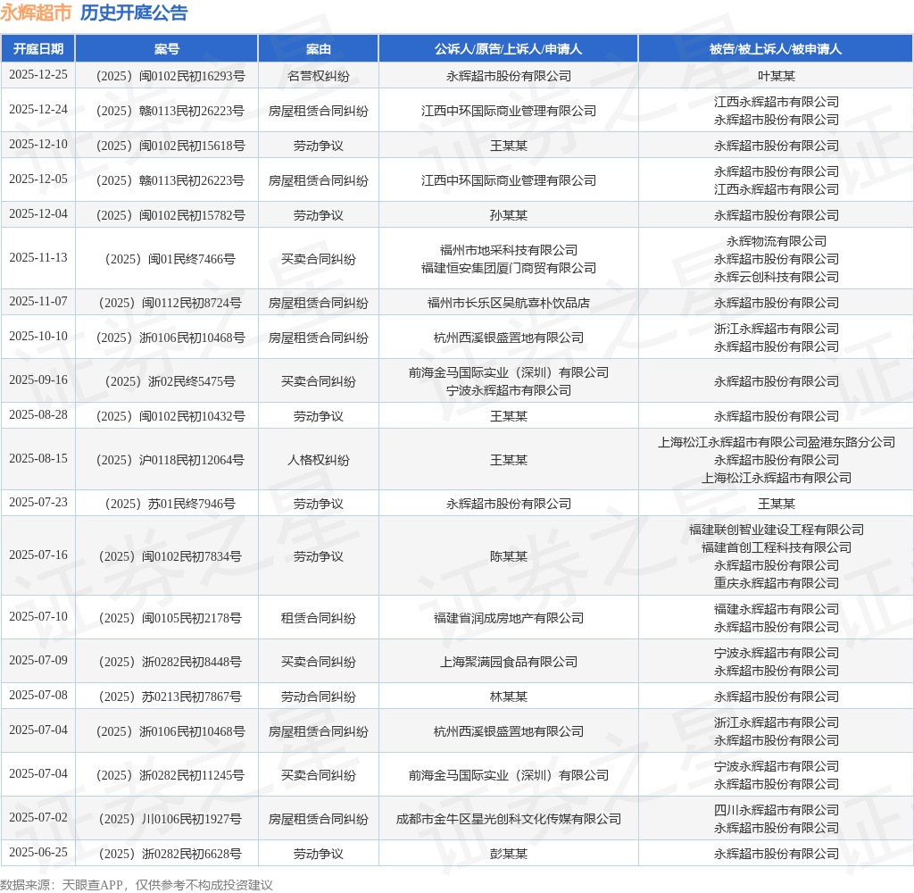 案号:(2025)闽0102民初15782号根据统计,近一年内以永辉超市股份有限公司为当事人的历史开庭公告有36则,其中案由为“房屋租赁合同纠纷”的公告以13则居首,其次为“买卖合同纠纷”有8则,“劳动争议”有7则。历史开庭公告(前20条)如下: