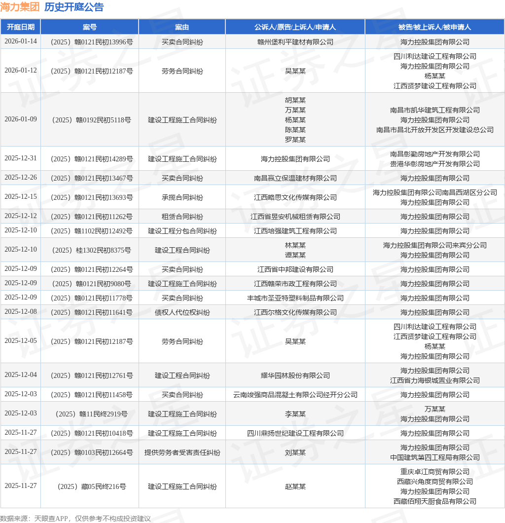 案号:(2025)赣0121民初12761号根据统计,近一年内以海力控股集团有限公司为当事人的历史开庭公告有211则,其中案由为“买卖合同纠纷”的公告以64则居首,其次为“建设工程施工合同纠纷”有41则,“劳务合同纠纷”有17则。历史开庭公告(前20条)如下: