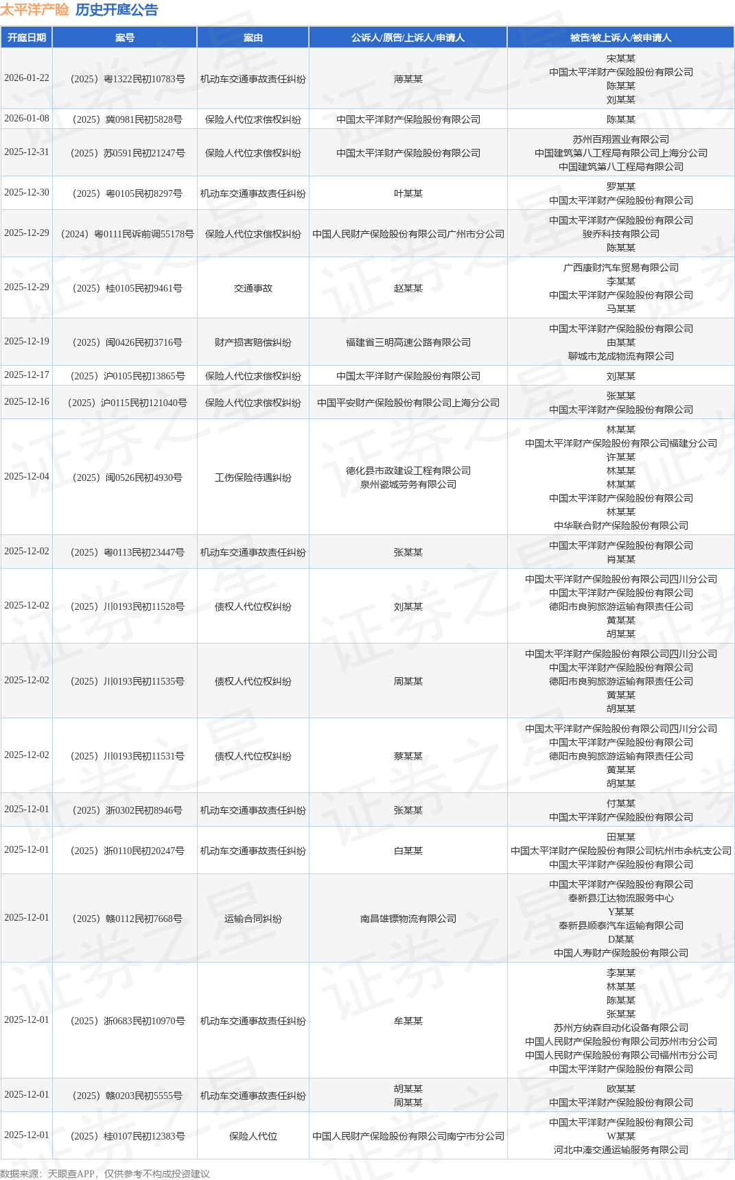 案号:(2025)闽0526民初4930号根据统计,近一年内以中国太平洋财产保险股份有限公司为当事人的历史开庭公告有725则,其中案由为“机动车交通事故责任纠纷”的公告以469则居首,其次为“保险人代位求偿权纠纷”有77则,“非机动车交通事故责任纠纷”有25则。历史开庭公告(前20条)如下: