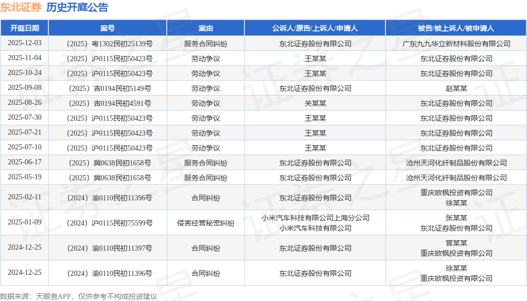 根据统计,近一年内以东北证券股份有限公司为当事人的历史开庭公告有14则,其中案由为“劳动争议”的公告以7则居首,其次为“合同纠纷”有3则,“服务合同纠纷”有3则。历史开庭公告如下: