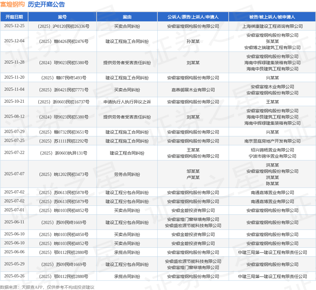 案号:(2025)赣0426民初2476号根据统计,近一年内以安徽富煌钢构股份有限公司为当事人的历史开庭公告有54则,其中案由为“承揽合同纠纷”的公告以14则居首,其次为“建设工程施工合同纠纷”有13则,“买卖合同纠纷”有8则。历史开庭公告(前20条)如下: